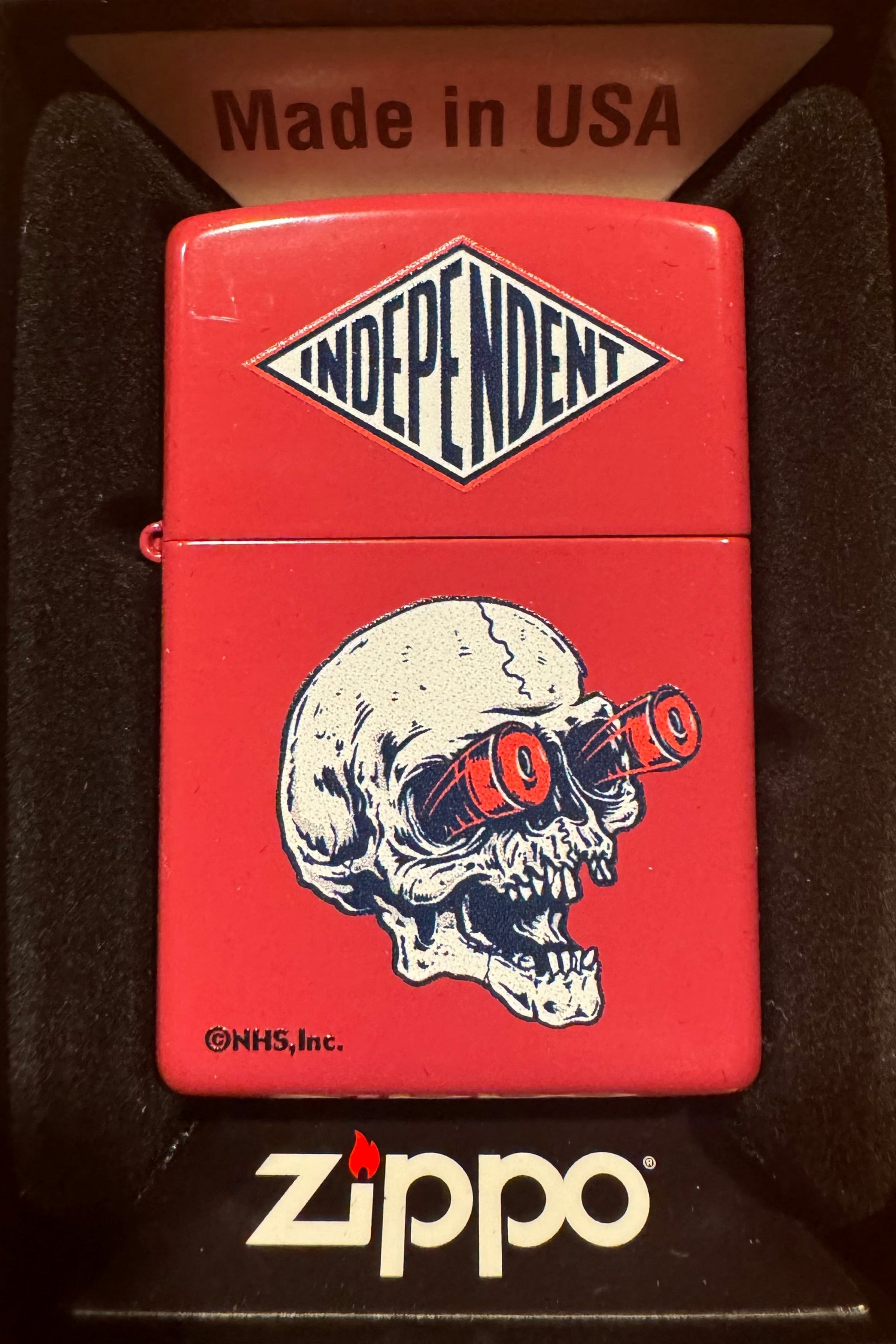 Introducing a new line of designs featuring NHS’s Independent Trucks brand iconic artwork. Inspired by the graphics that are splashed across their trucks, this windproof lighter features the new Independent logo and color imaged on a Brick Red lighter. Comes packaged in a gift box. For optimal performance fill with Zippo lighter fuel.
