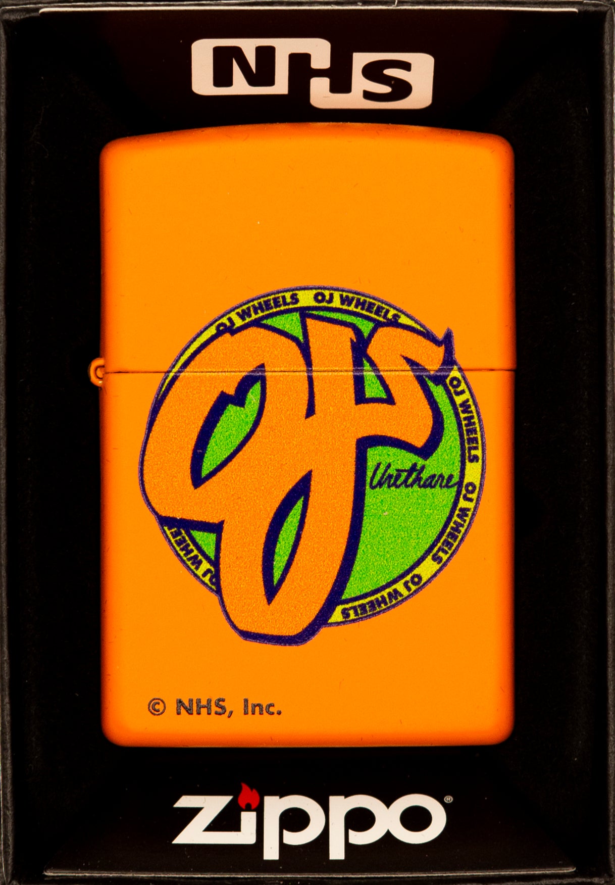 Introducing a new line of designs featuring NHS's OJ's brand iconic artwork. Inspired by the vivid graphics that are splashed across their skateboard wheels, this windproof lighter features the iconic OJ's graphic, which is color imaged on an Orange Matte lighter. Comes packaged in a gift box. For optimal performance fill with Zippo lighter fuel.