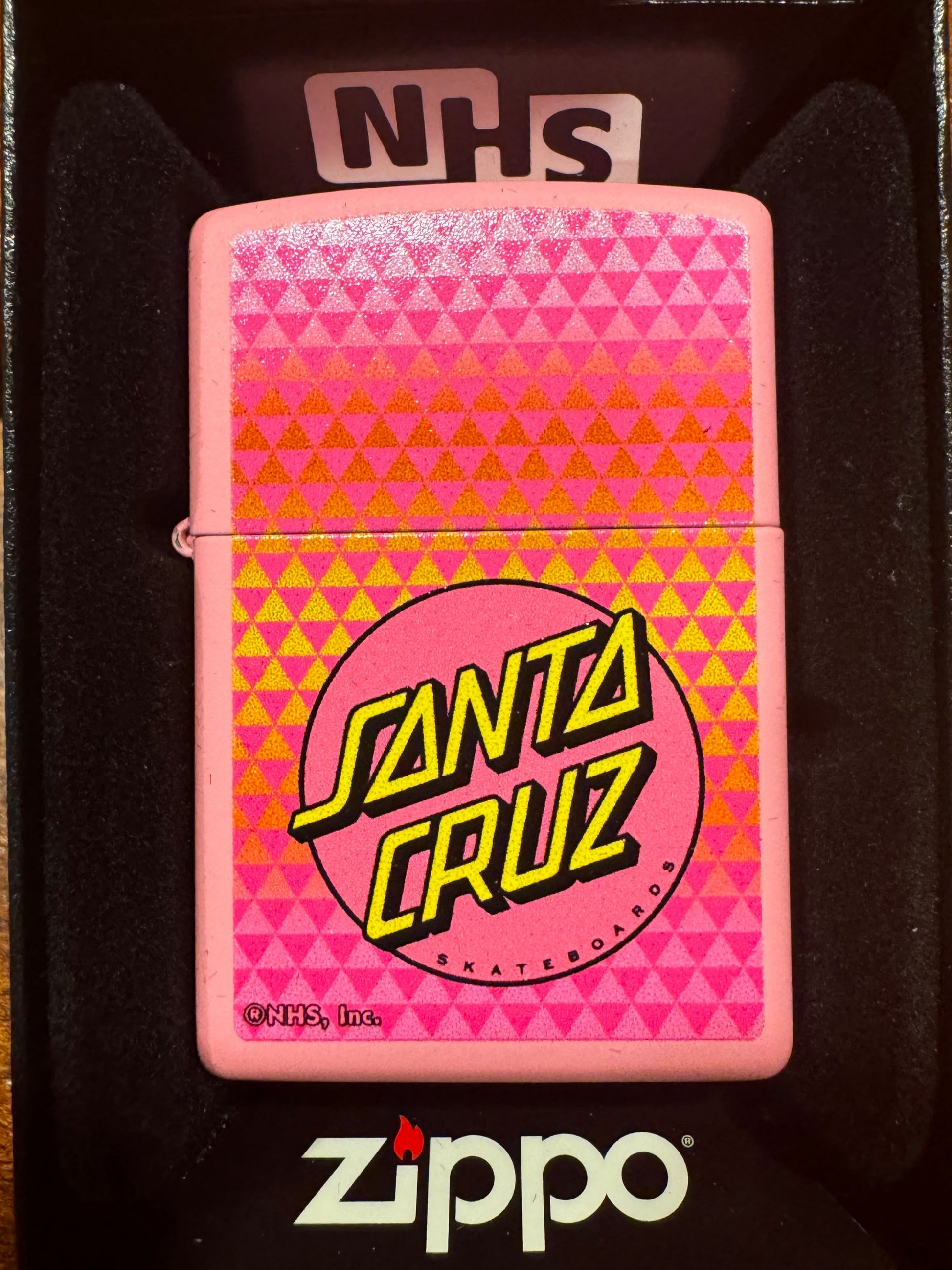 Introducing a new line of designs featuring Santa Cruz Skateboards’ iconic artwork. Inspired by the vivid pop-art graphics that are splashed across their skateboard decks, this windproof lighter features the iconic Santa Cruz Dot graphic, which is color imaged on a Pink Matte lighter. Comes packaged in a gift box. For optimal performance fill with Zippo lighter fuel.