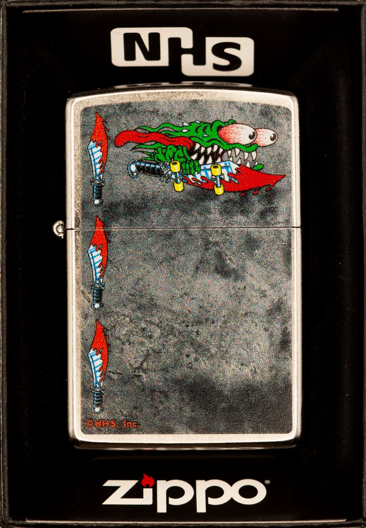Introducing a new line of designs featuring Santa Cruz Skateboards’ iconic artwork. Inspired by the vivid pop-art graphics that are splashed across their skateboard decks, this windproof lighter features the Santa Cruz Slasher graphic by Keith Meek, which is color imaged on a Chrome lighter. Comes packaged in a gift box. For optimal performance fill with Zippo lighter fuel.